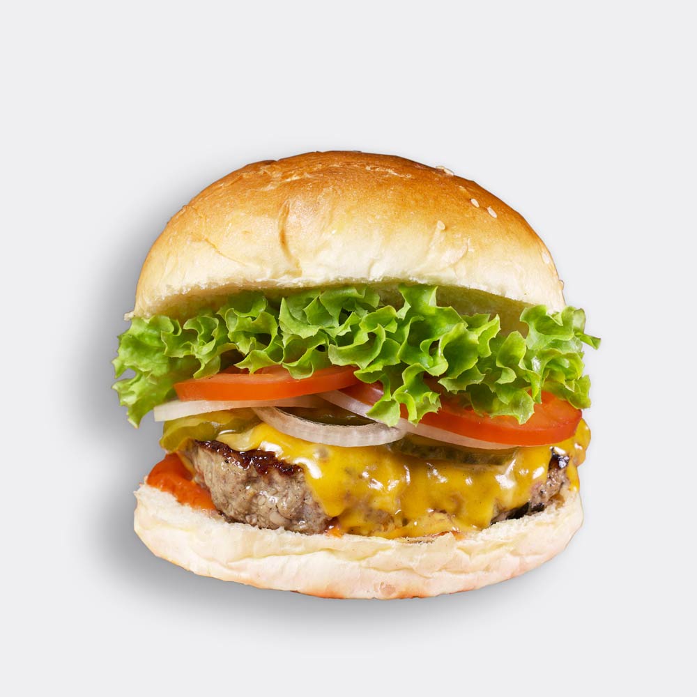 Frisch gegrilltes Beef Patty (160 g), geschmolzener kräftiger Cheddar Cheese, Tomate, Salat, Gewürzgurke, Zwiebeln, Ketchup, Honigsenf