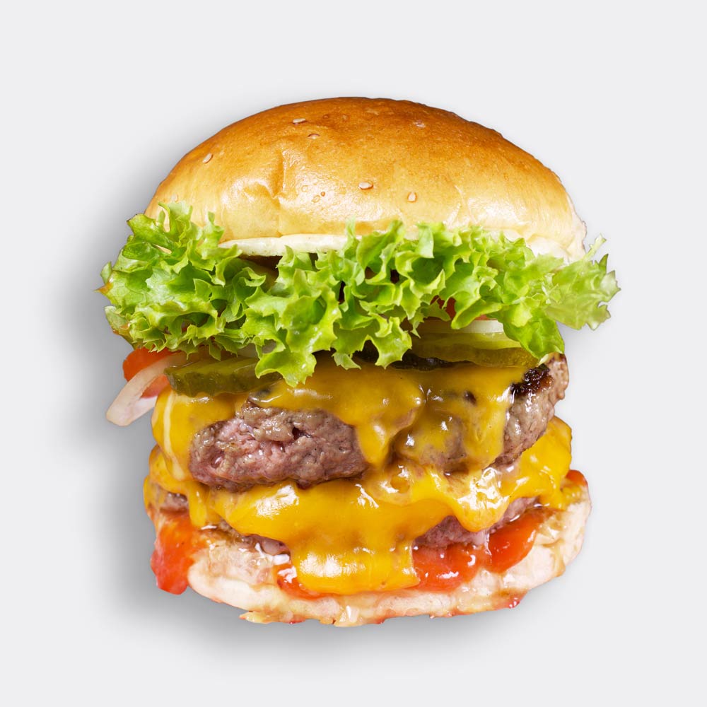 Zwei frisch gegrillte Beef Patties (a 160 g), doppelte Ladung geschmolzener kräftiger Cheddar Cheese, Tomate, Salat, Gewürzgurke, Zwiebeln, Ketchup, Honigsenf